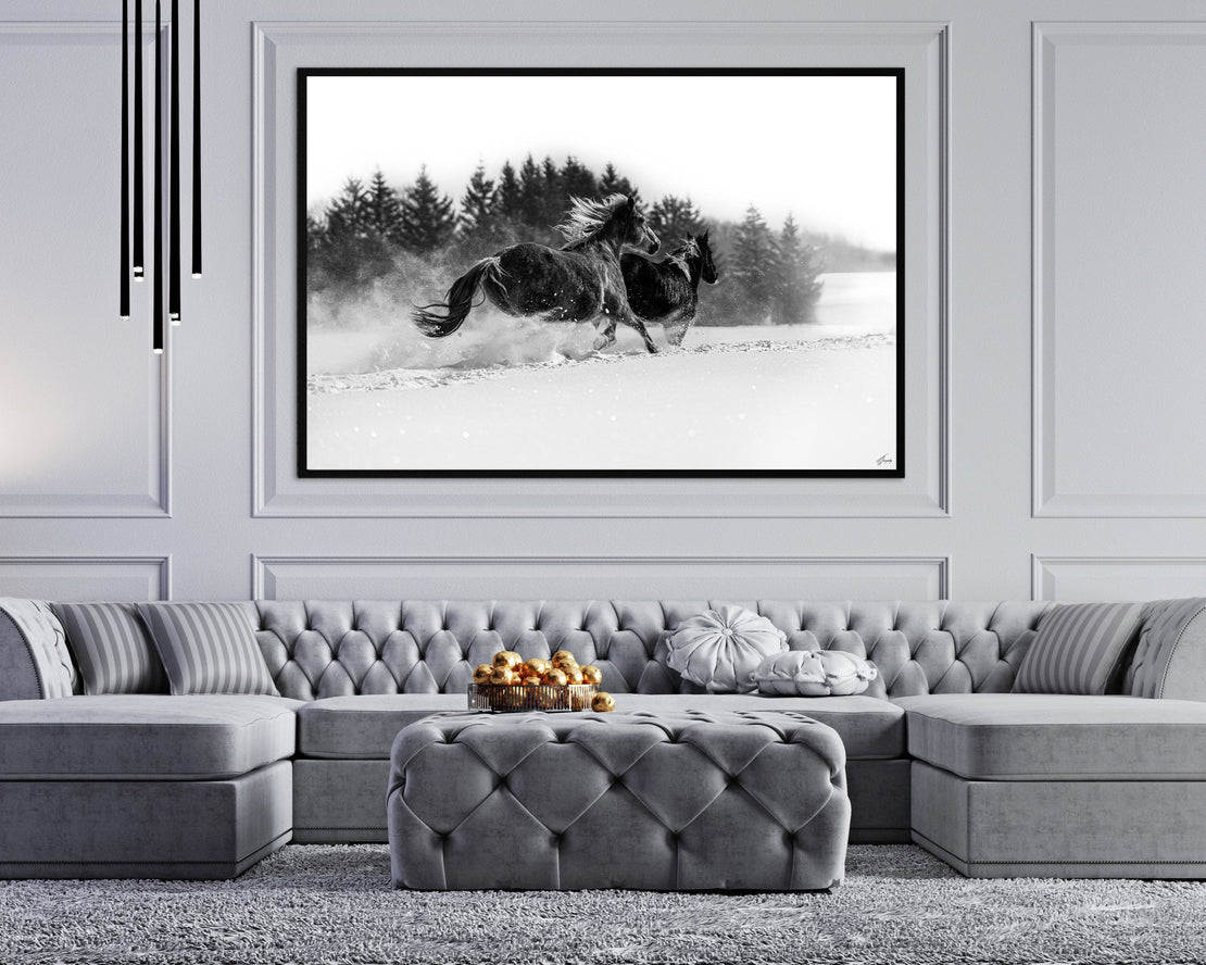 C'est l'une de mes prises préférées de cette collection. Un angle artistique, un arrière-plan qui ne pourrait mieux représenter l'hiver canadien, et un premier plan magique. Le soleil au zénith sous lequel des flocons semblables à des diamants explosent sous le bruit des sabots galopants.