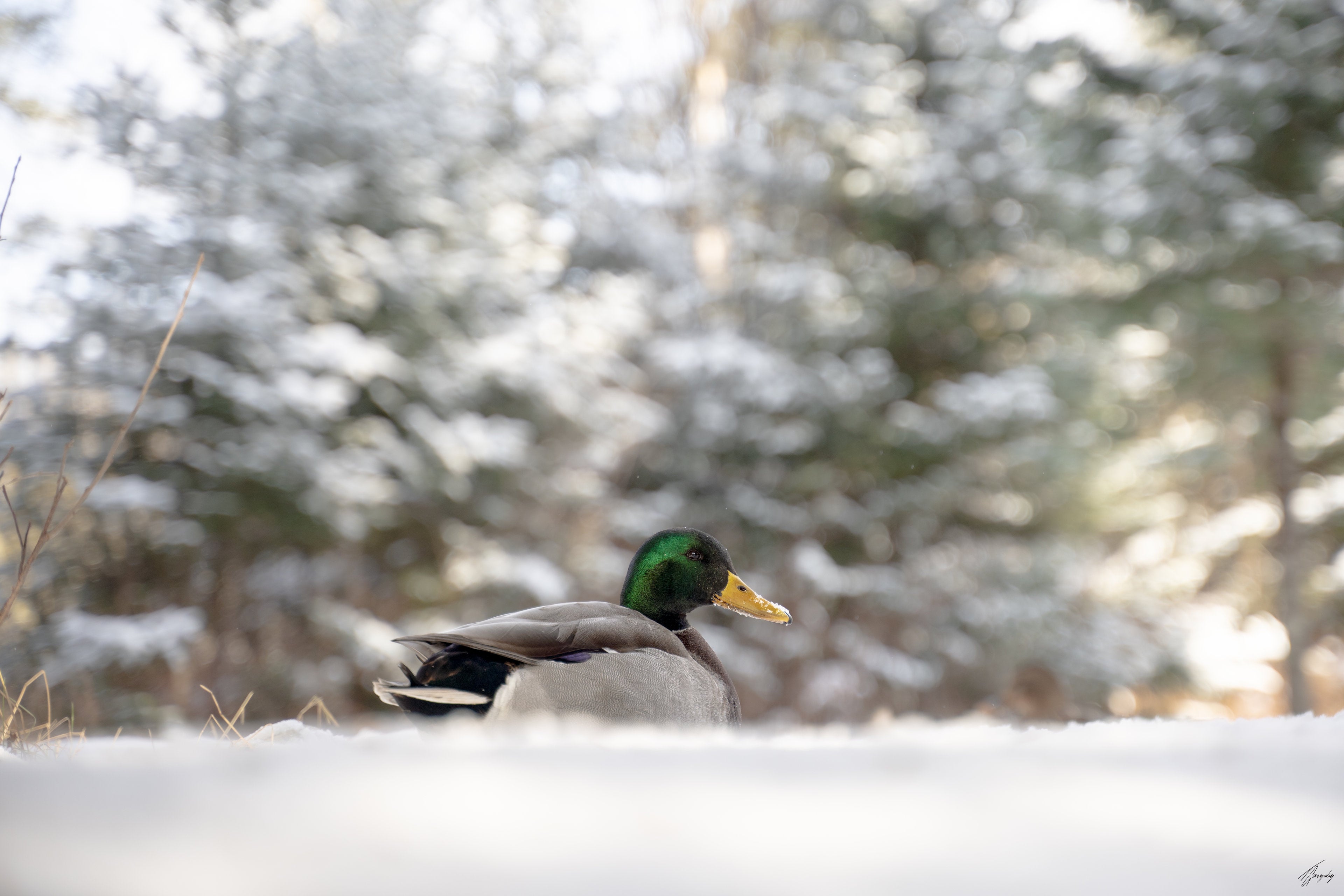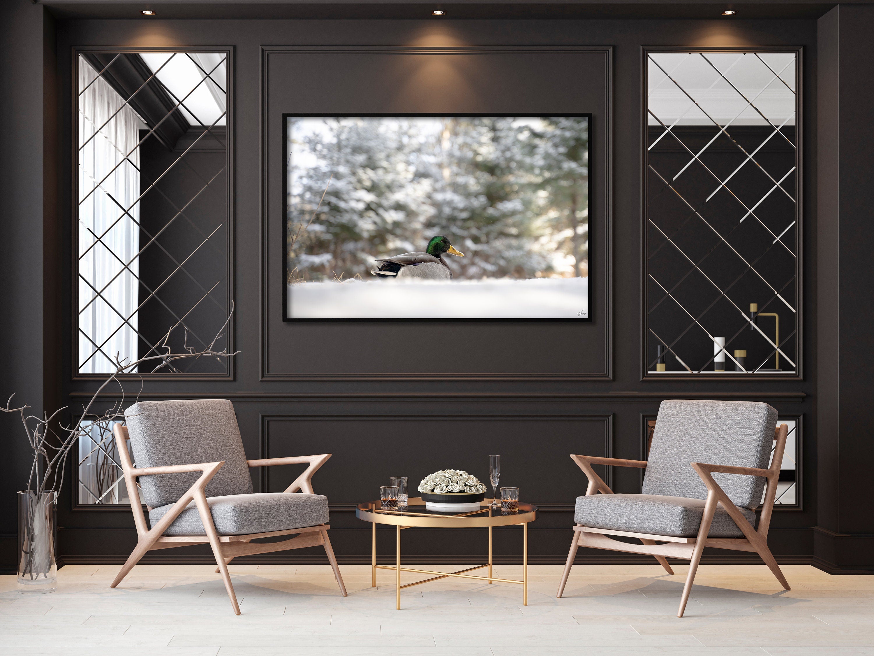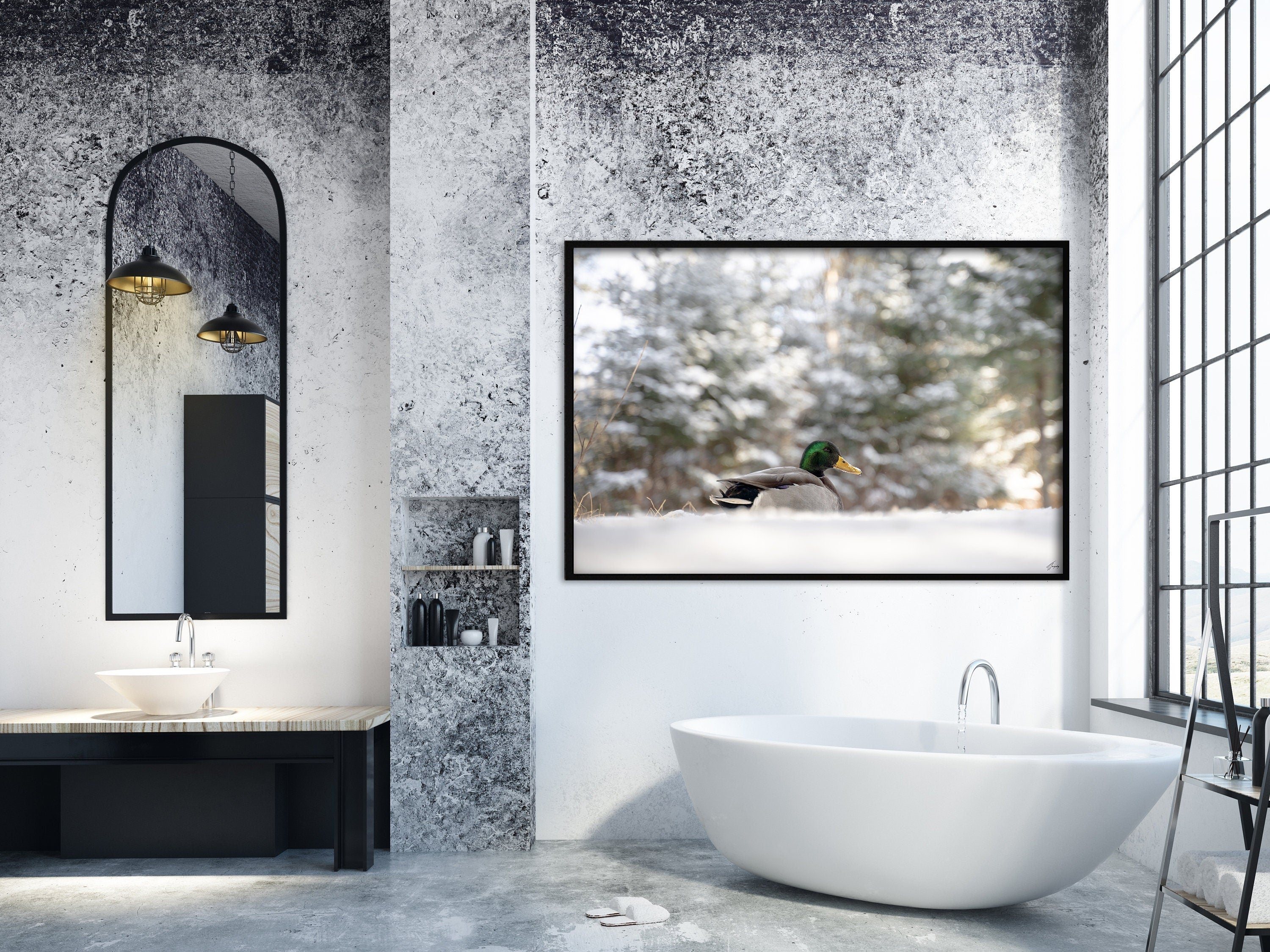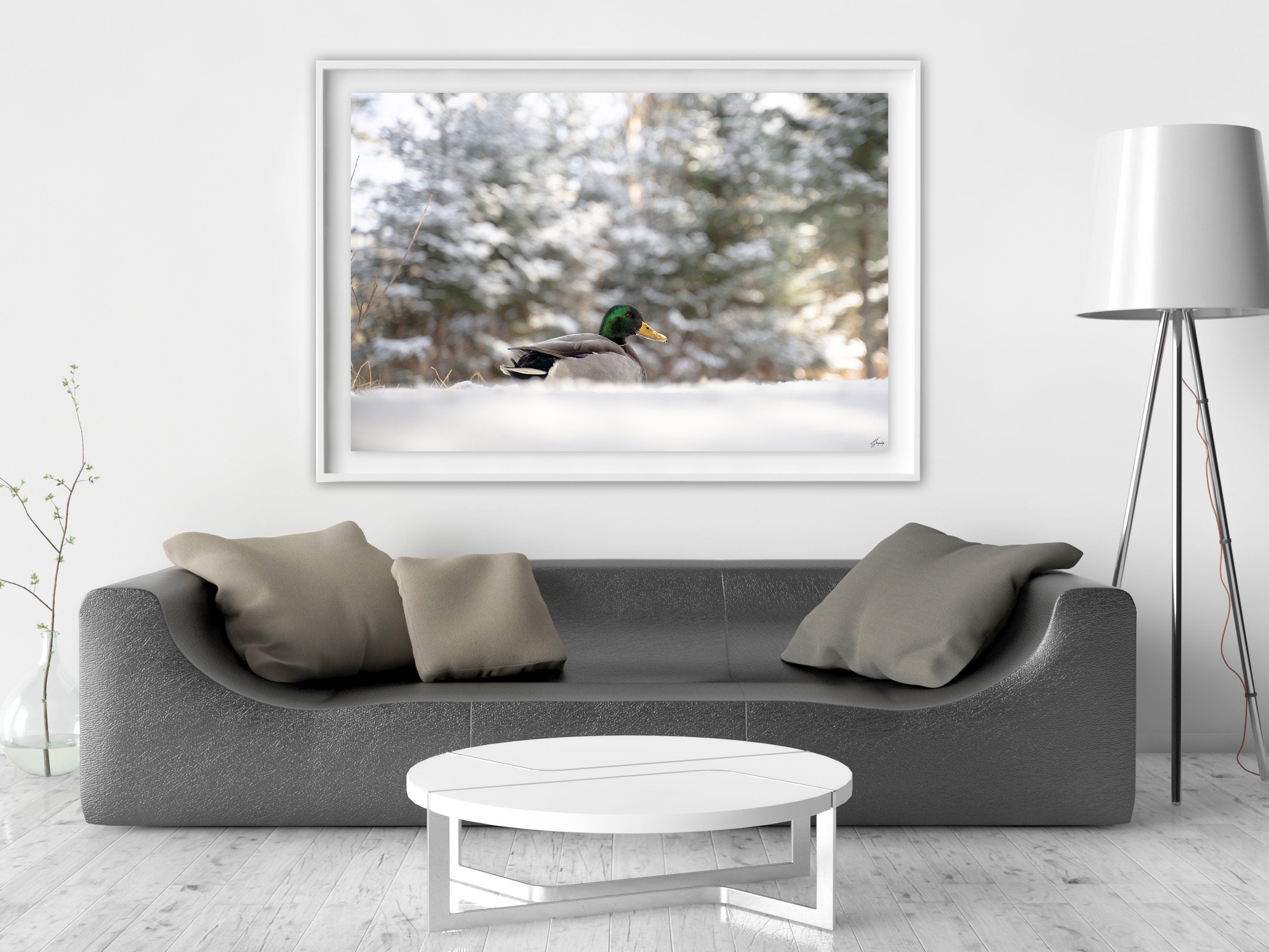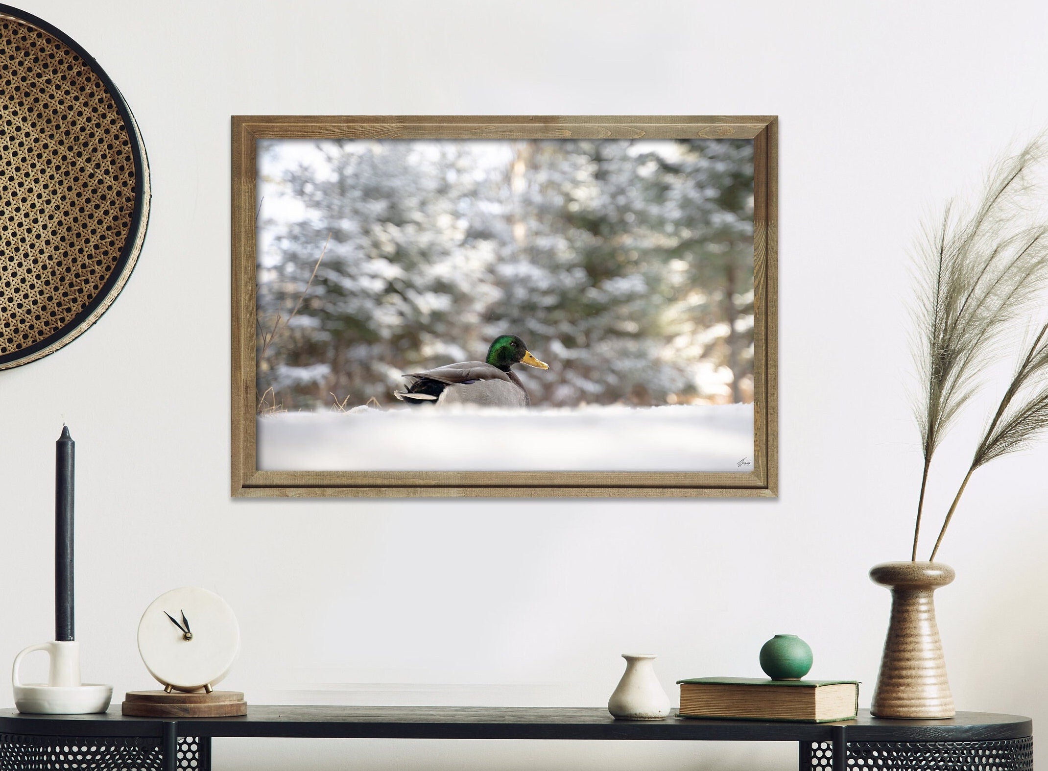 Un canard se tient tranquillement dans la neige, contrastant avec la blancheur hivernale de son décor. Cette photographie capture la résilience et la beauté sereine de la faune en plein cœur de l’hiver. Idéale pour apporter une touche de force tranquille et de charme saisonnier à votre espace.