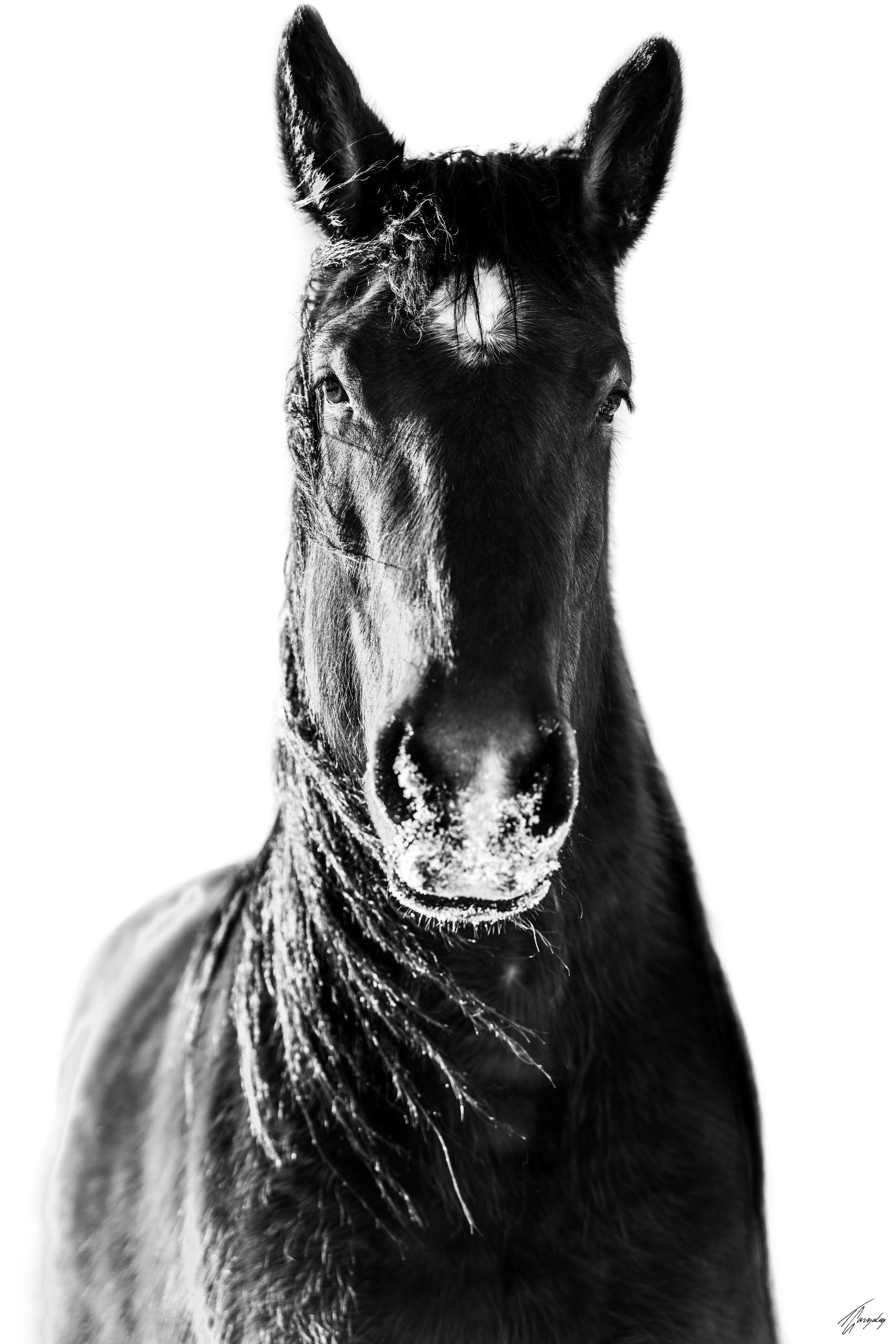Voici le portrait d'un cheval nordique imposant et majestueux. Accroupi dans la neige, je le regarde s'approcher et j'essaie de ne pas sursauter lorsqu'il laisse échapper son puissant souffle fumant. Il s'arrête à quelques mètres de moi, face à moi…