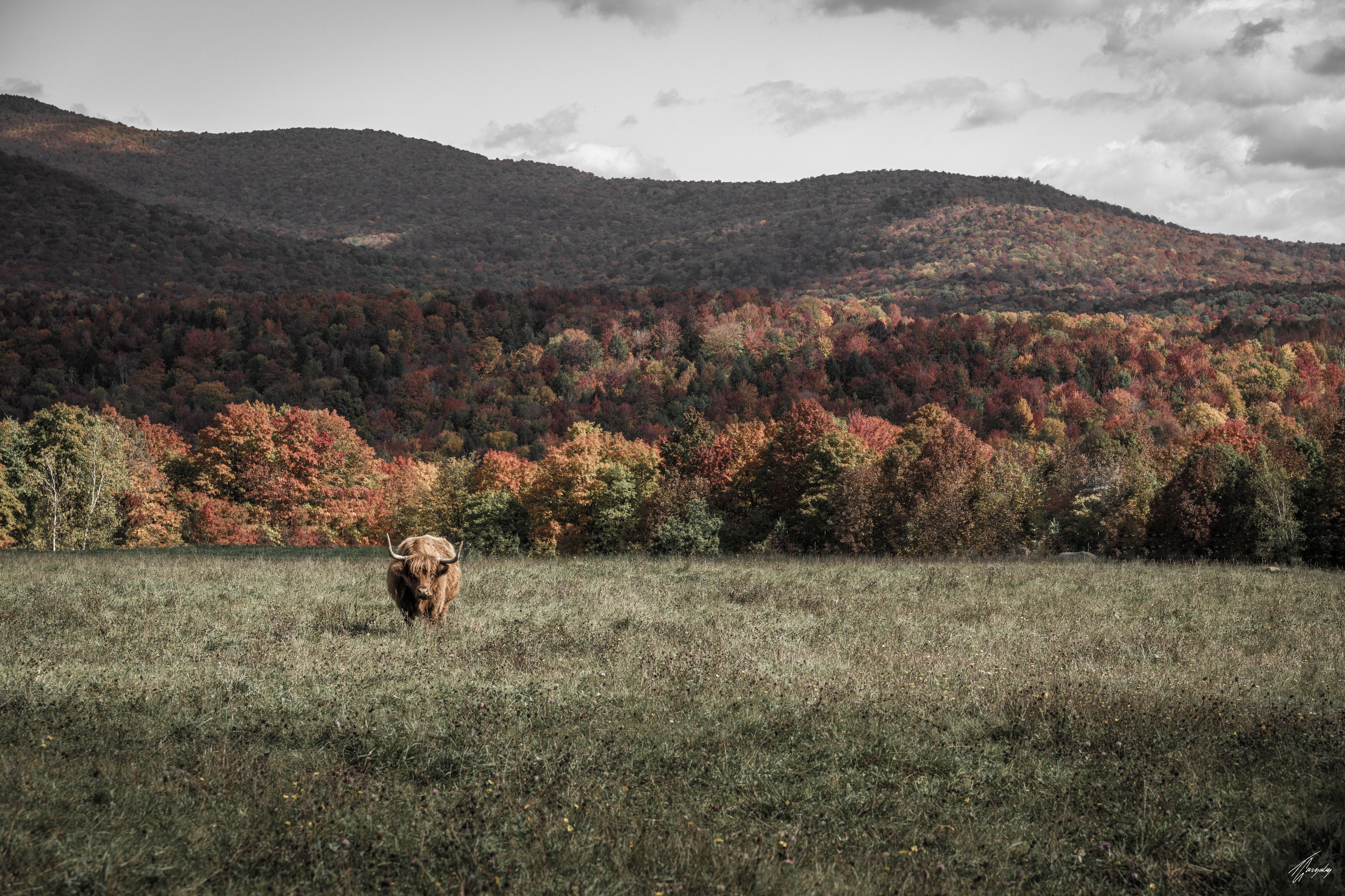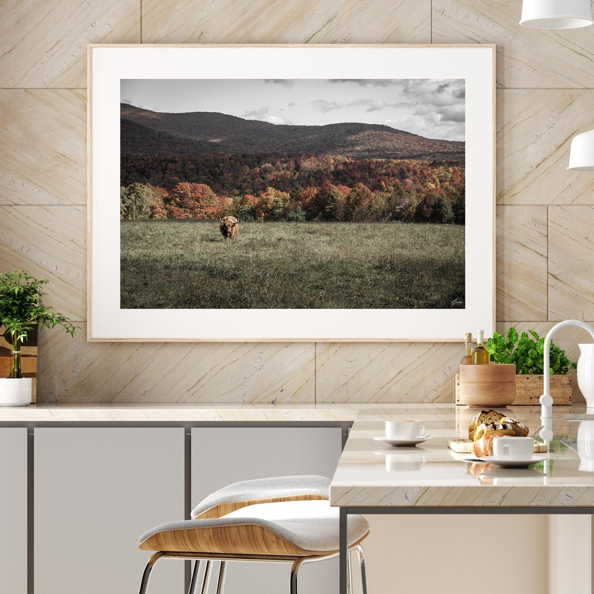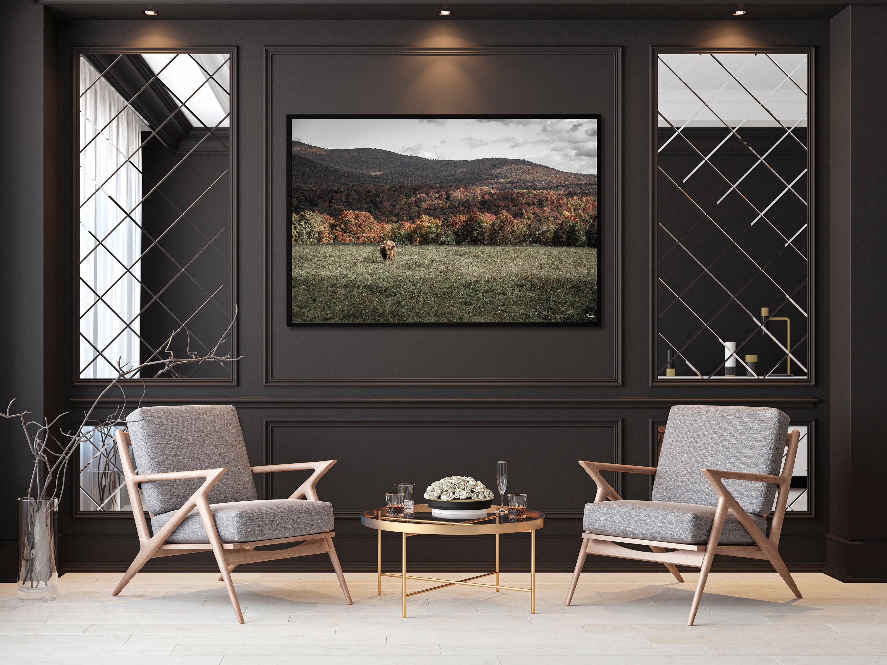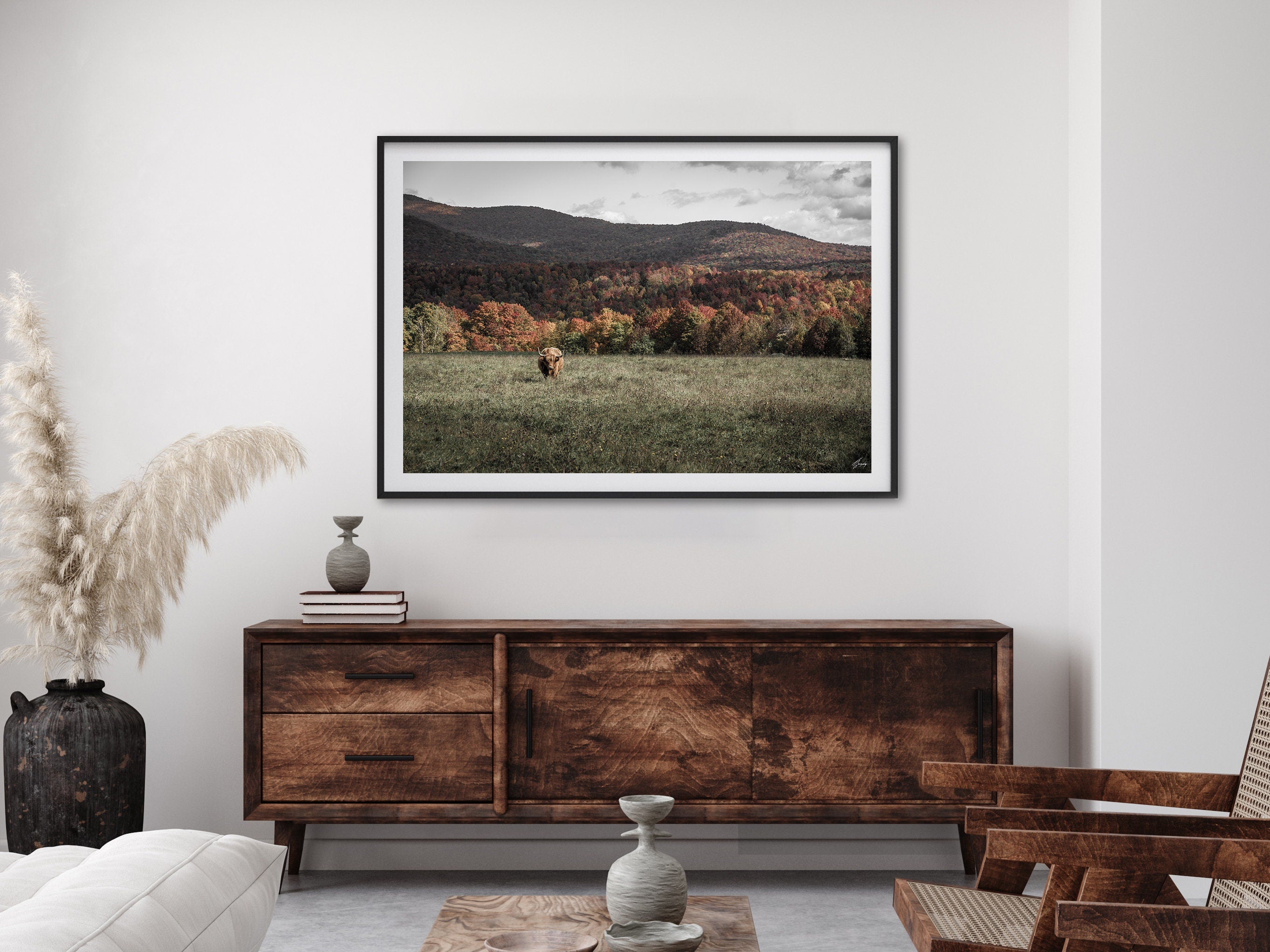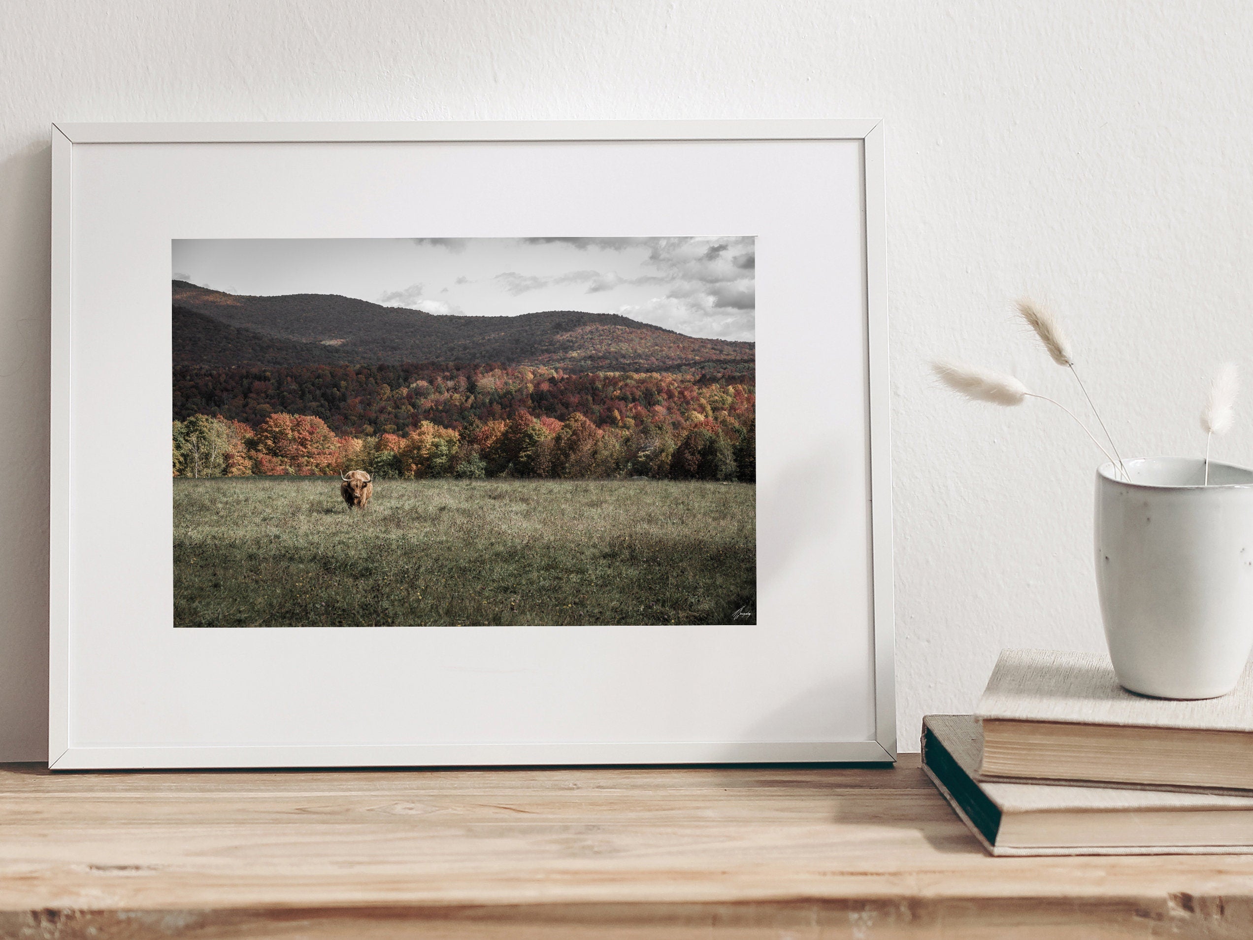 Je voulais photographier des vaches Highland depuis longtemps, mais je cherchais des images qui se démarquent de ce qu’on voit habituellement. J’ai donc attendu le moment idéal : au cœur de l’automne, quand les couleurs sont à leur apogée, pour offrir à ces animaux sympathiques un arrière-plan aux tons chauds et variés. J’ai passé plusieurs heures avec elles, à observer leur comportement, à anticiper leurs déplacements, et à chercher le meilleur angle en explorant les montagnes colorées. En me préparant, je rêvais d’une prise de vue minimaliste, en harmonie avec le paysage : une seule vache, tranquille, dans une grande profondeur de champ, où l’on pourrait apprécier autant les détails de l’animal que ceux du décor. Le résultat est une image forte et contrastée, pleine de caractère, qui sublimera n’importe quel espace – même dans son plus grand format.