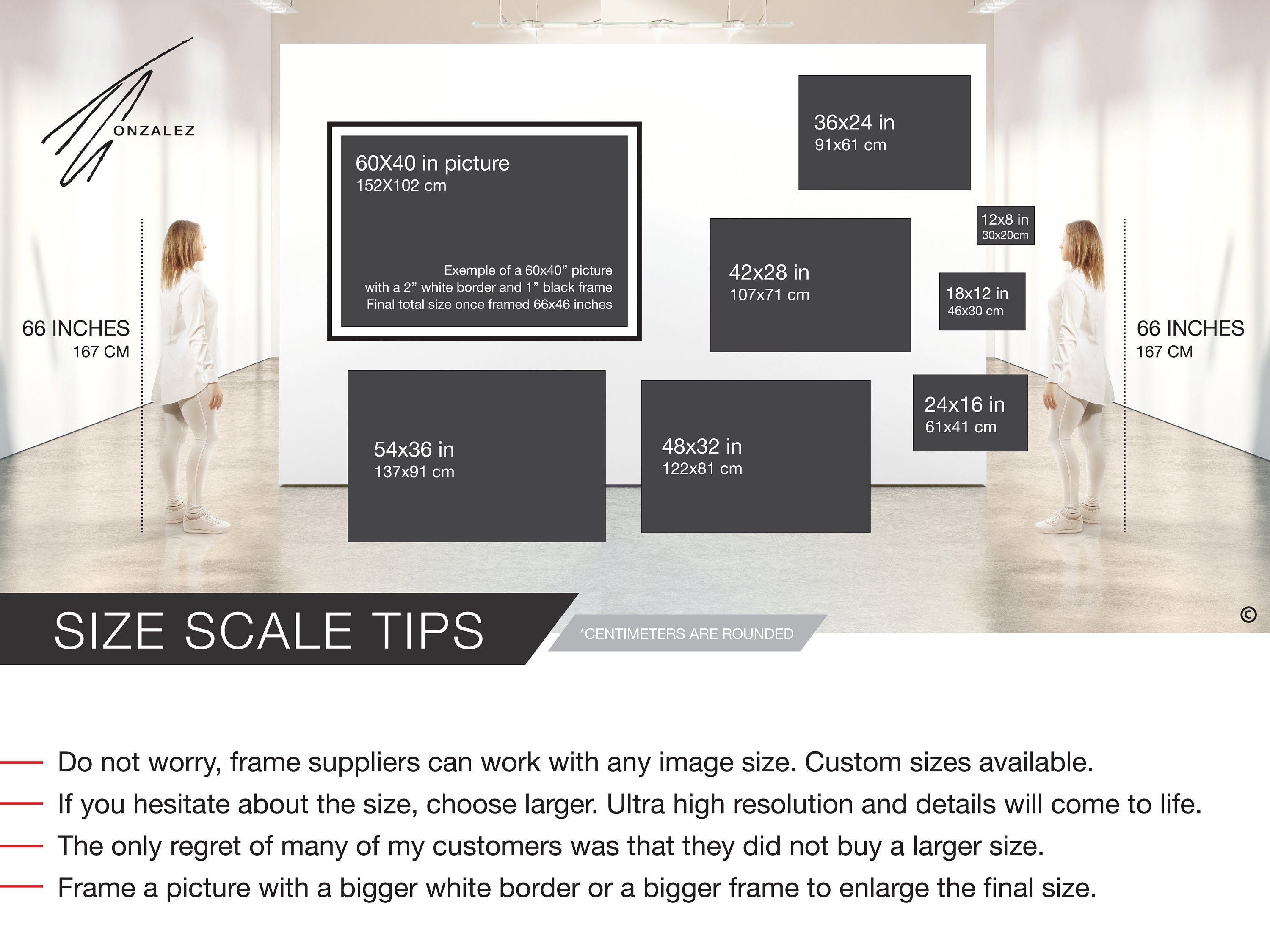 Une option populaire consiste à acheter une oeuvre sur papier beaux-arts sans cadre dans un format standard comme 30x20 ou 36x24, et à acheter un cadre standard chez un grand détaillant. Vous pouvez facilement encadrer vous-même votre oeuvre. Et n'oubliez pas : vous pouvez nous demander de personnaliser le format et la bordure blanche pour correspondre aux dimensions de votre cadre.